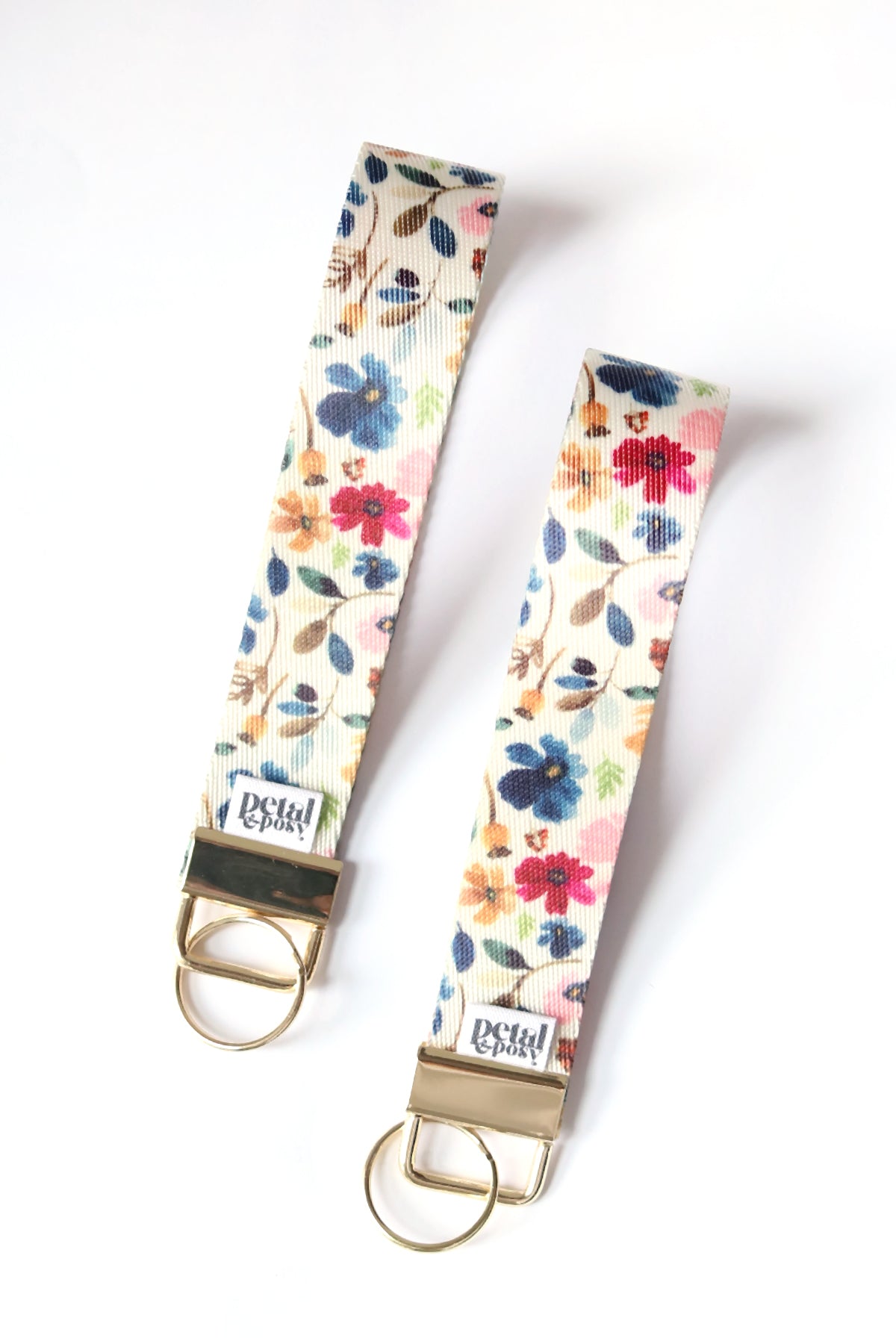 These keychain wristlets are SO handy - never search around in your handbag again for your keys. Made with durable nylon webbing printed in a wildflower pattern on gold hardware.